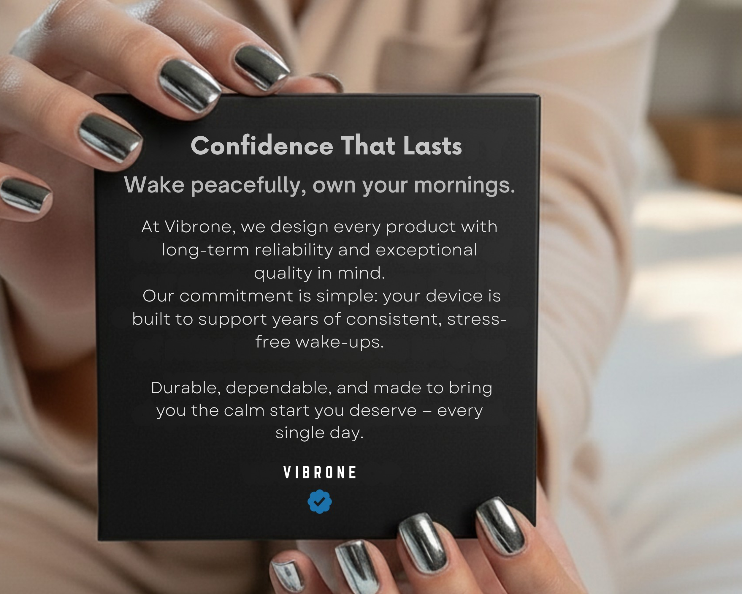 From the discreet Vibrone wristband to our growing line of sleep-tech essentials, every product is crafted to deliver a silent vibration alarms for peaceful wake-ups, a secure and comfortable fit and refined premium materials - all supported by a 2-year warranty.